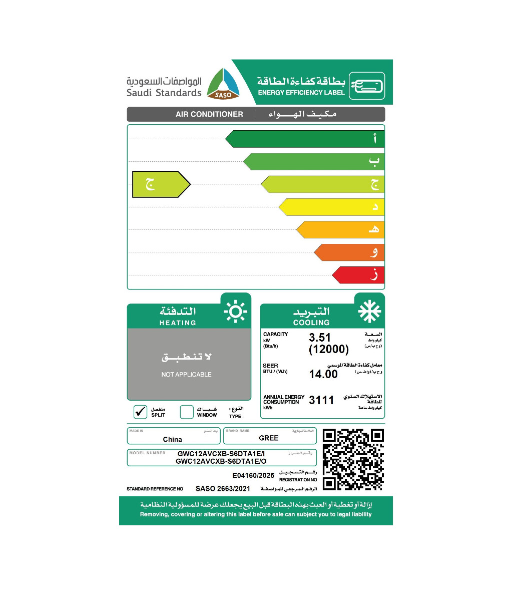 مكيف جري اسبليت جداري، اي بلس، بارد فقط، قدرة 12000 وحدة ، انفرتر- واي فاي – ذكاء اصطناعي – تنظيف ذاتي – تعقيم – اربعة اتجاهات – فريون 32 – GWC12AVCXB-S6DTA1E