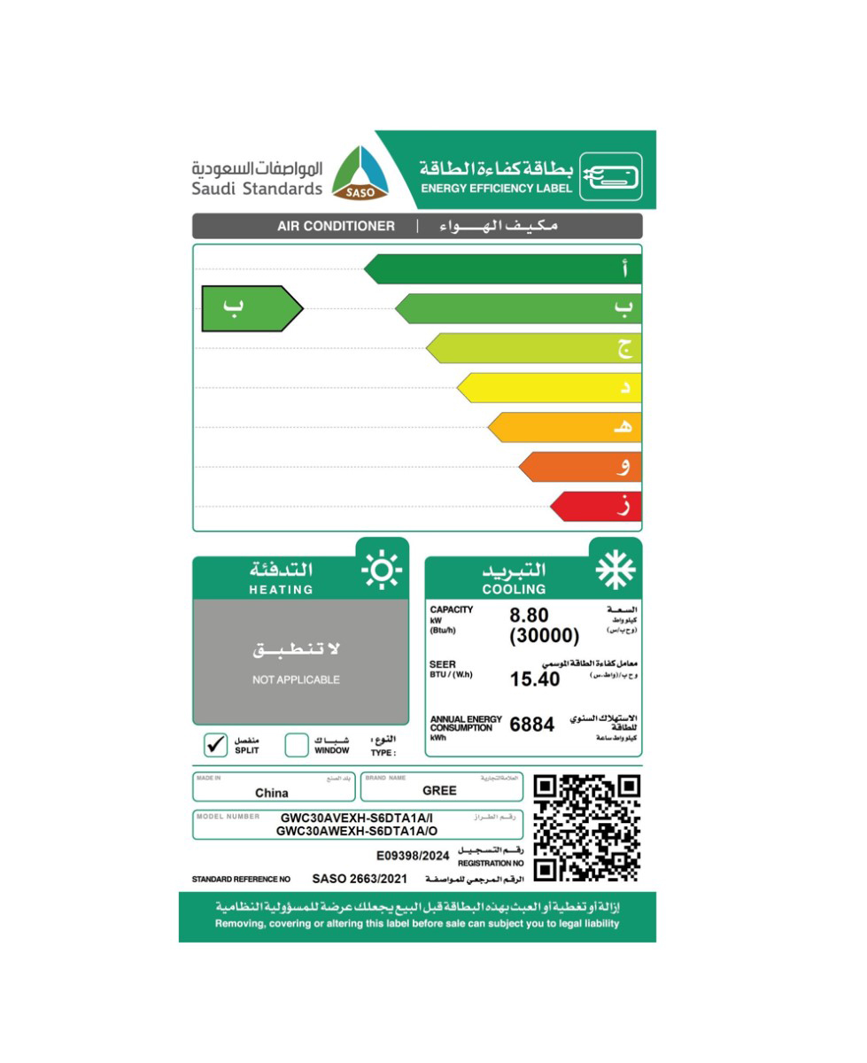 مكيف جري اسبليت جداري، اي بلس، بارد فقط، قدرة 30000 وحدة ، انفرتر- واي فاي – ذكاء اصطناعي – تنظيف ذاتي – تعقيم – اربعة اتجاهات – فريون 32 – GWC30AVEXH-S6DTA1A